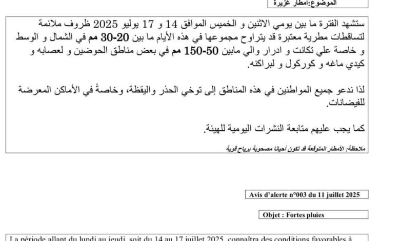 تانيد ميديا : توقعت الهيئة الوطنية للأرصاد الجوية ، أن تشهد الفترة من 14 إلى 17 من الشهر الجاري تساقطات مطرية غزيرة مصحوبة برياح قوية.