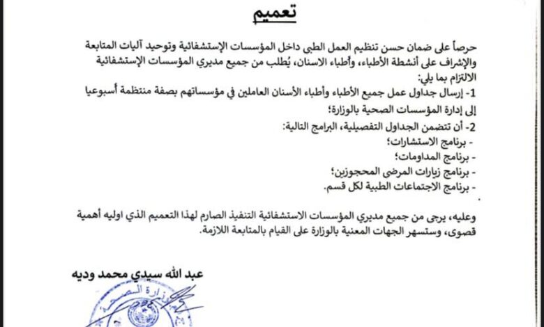 تانيد ميديا : أصدر وزير الصحة عبد الله سيدي محمد وديه تعميما لتنظيم عمل الأطباء وأطباء الأسنان، وذلك عبر إرسال جداول عملهم في مؤسساتهم بصفة منتظمة أسبوعيا إلى إدارة المؤسسات الصحية بالوزارة.