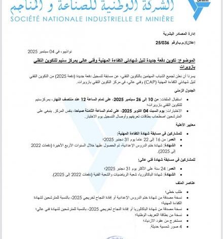 شركة سنيم تفتتح الترشح لتكوين دفعات جديدة في شهادتي الكفاءة المهنية وفني عالي