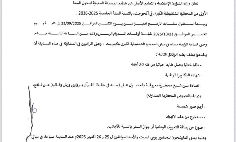 تانيد ميديا : أعلنت وزارة الشؤون الإسلامية والتعليم الأصلي فتح باب الترشح للمسابقة السنوية لدخول السنة الأولى من المحظرة الشنقيطية الكبرى بأكجوجت برسم العام الدراسي 25-2026.