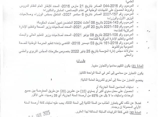 وأوضح البيان أن شروط النجاح والانتقال محددة في المادة 31 من المرسوم رقم 044/2016 الصادر بتاريخ 21 مارس 2016، والتي تشترط لاستيفاء السنة الدراسية أحد الأمرين: