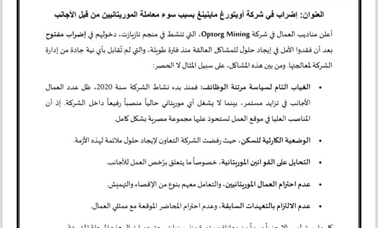 تانيد ميديا : أعلن مناديب العمال في شركة Mining Optorg، العاملة في منجم تازيازت، دخولهم في إضراب مفتوح بسبب ما وصفوه بـ “سوء المعاملة والتهميش المستمر للعمال الموريتانيين”.