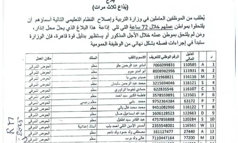 وقالت الوزارة في بلاغها، إن المدرسين المعنيين إذا لم يلتحقوا بمواطن عملهم خلال 72 ساعة أو يستظهروا بدليل قوة قاهرة فإنها ستبدأ في إجراءات فصلهم بشكل نهائي من الوظيفة العمومية.