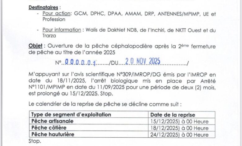 تانيد ميديا : وزارة الصيد والبني التحتية البحرية و المينائية في تعميم أصدرتهقبل يوم عن تاريح استئناف نشاط الصيد البحري في موريتانيا.