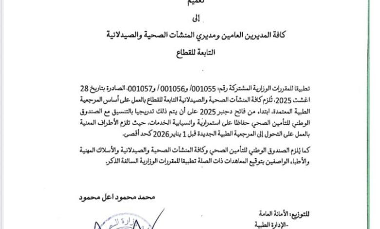 وزارة الصحة تصدر تعميما بخصوص المرجعية الطبية إلى كافة المنشآت الصحية .