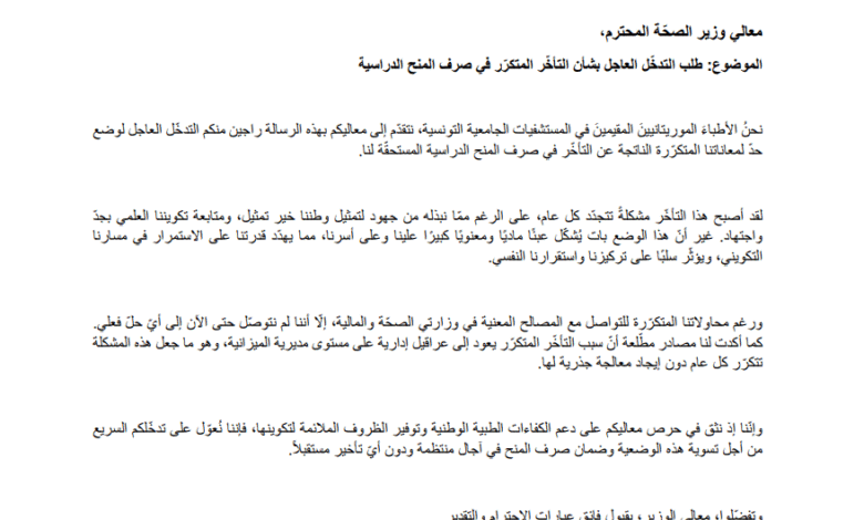 ودعا الأطباء في رسالة وجهوها لوزير الصحة إلى العمل من أجل وضع حد لمعاناتهم “المتكررة الناتجة عن تأخر صرف المنح الدراسية المستحقة”.