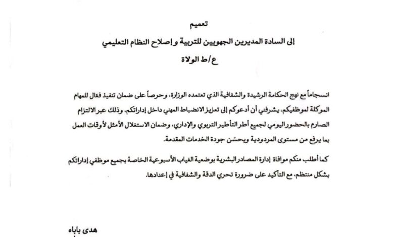 ودعت الوزارة المديرين الجهويين للتربية إلى تعزيز الانضباط المهني داخل إداراتهم، وذلك عبر الالتزام الصارم بالحضور اليومي لجميع أطر التأطير التربوي والإداري.