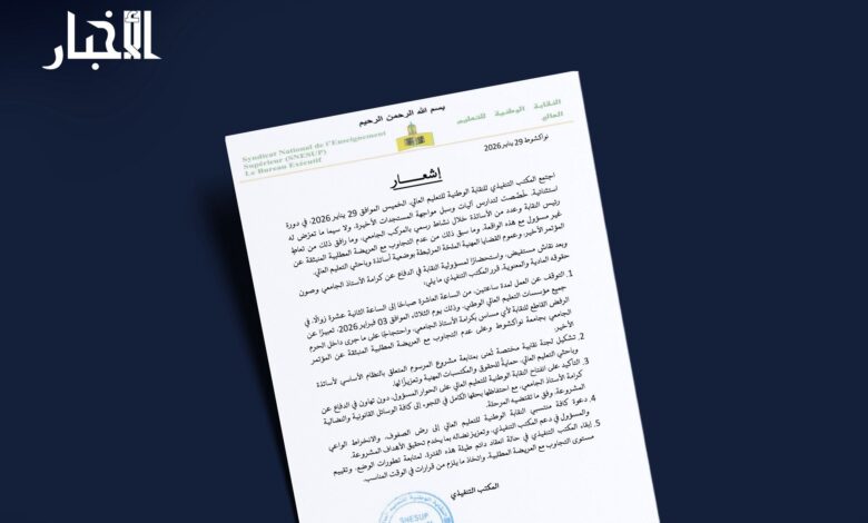 وأعلنت النقابة انفتاحها على الحوار المسؤول دون تهاون في الدفاع عن كرامة الأستاذ الجامعي، مؤكدة إبقاء مكتبها التنفيذي في حالة انعقاد دائم لمتابعة تطورات الوضع وتقييم مستوى التجاوب مع العريضة المطلبية.